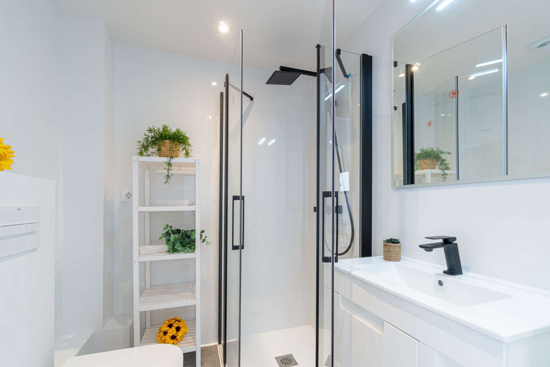 De badkamer is modern afgewerkt en voorzien van een ruime inloopdouche.