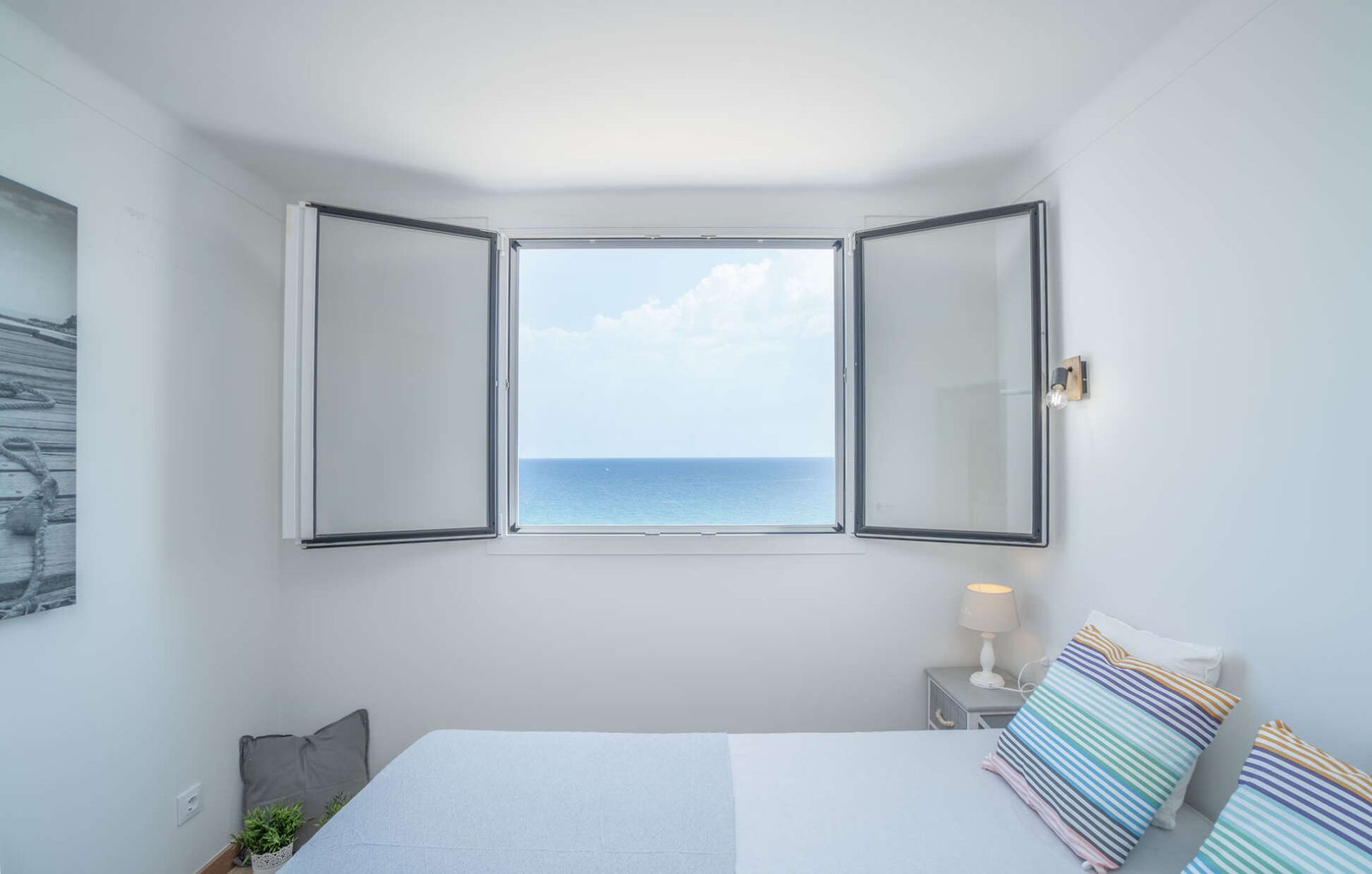 Het appartement beschikt over twee slaapkamers. De hoofdslaapkamer biedt direct zeezicht, waardoor u elke ochtend wakker wordt met een prachtig panorama. De tweede slaapkamer is ideaal als logeerkamer, kinderkamer of bijvoorbeeld als werkruimte.