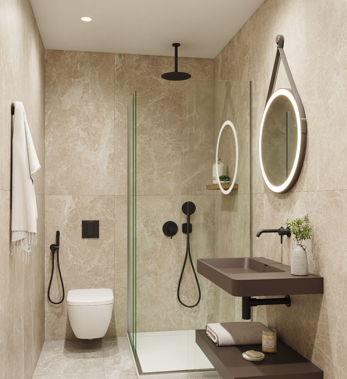 De twee gastenslaapkamers liggen aan de andere kant van het appartement en beschikken over ingebouwde garderobekasten met schuifdeuren, lades, planken en een kledingrail. Deze slaapkamers delen samen de tweede badkamer. De master bedroom ligt naast de woonkamer en beschikt over een eigen badkamer ensuite.