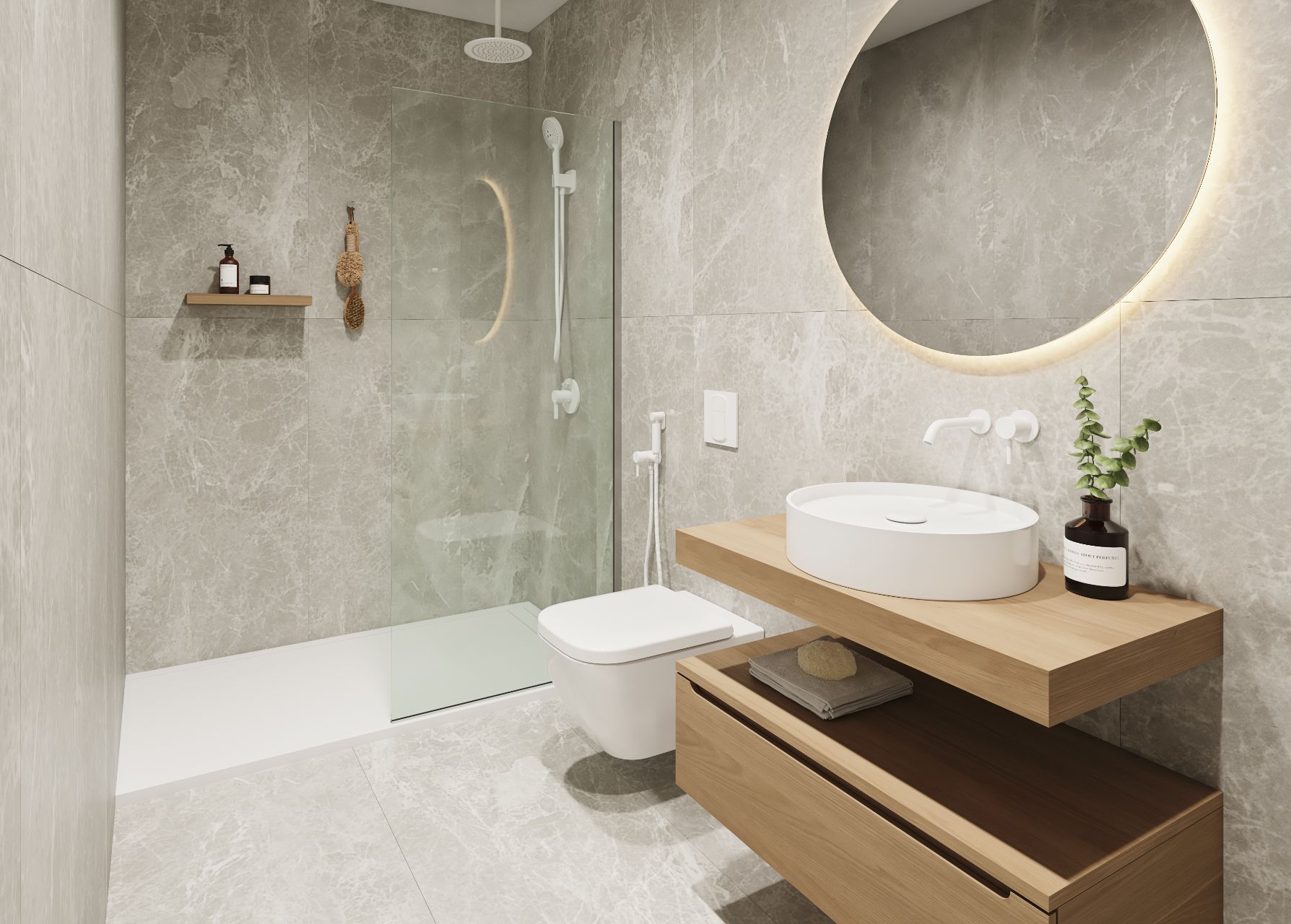De appartementen op de verdieping hebben een terras op de woonetage en daarnaast een royaal privé solarium van circa 60 m². Hier vindt u al een pergola, een buitenkeuken, een buitendouche en een voorbereide zone voor een jacuzzi. Een gedeelte van het dakterras is voorzien van kunstgras, waardoor u er een comfortabele loungeplek kunt creëren.