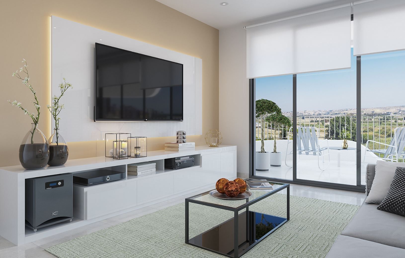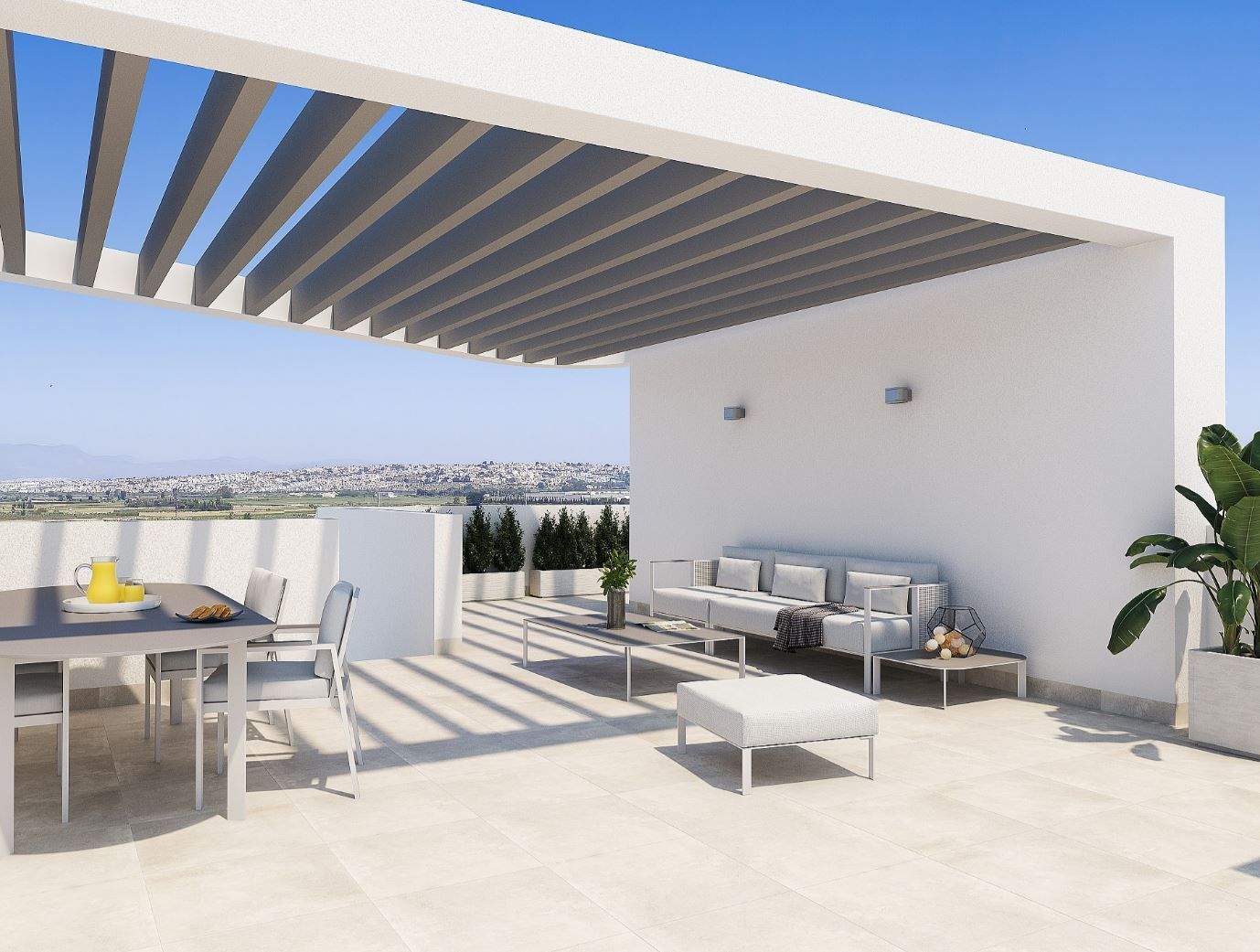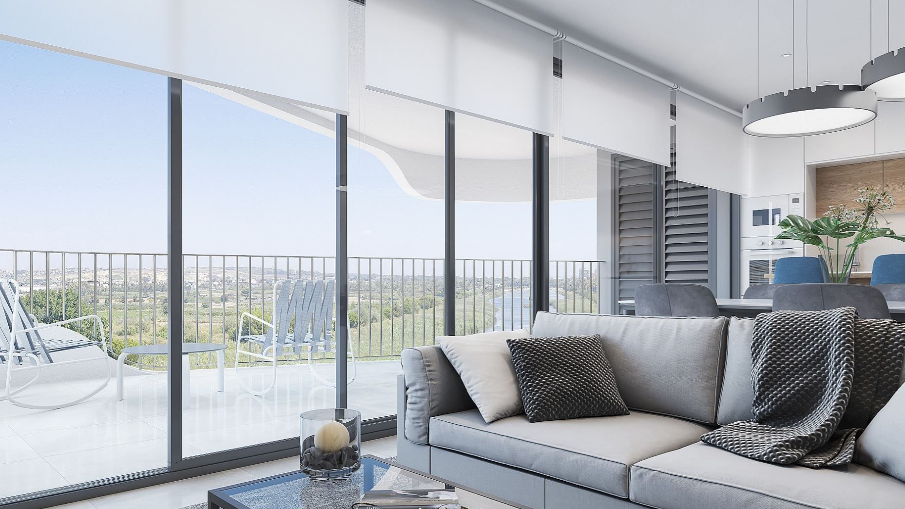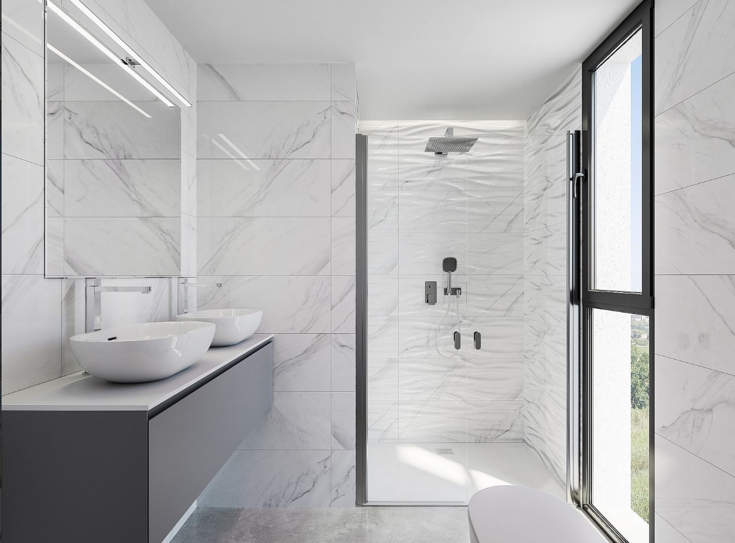 Aan de andere kant daarvan bevindt zich de zithoek, die grenst aan het grotere terras van ongeveer 18 m2.