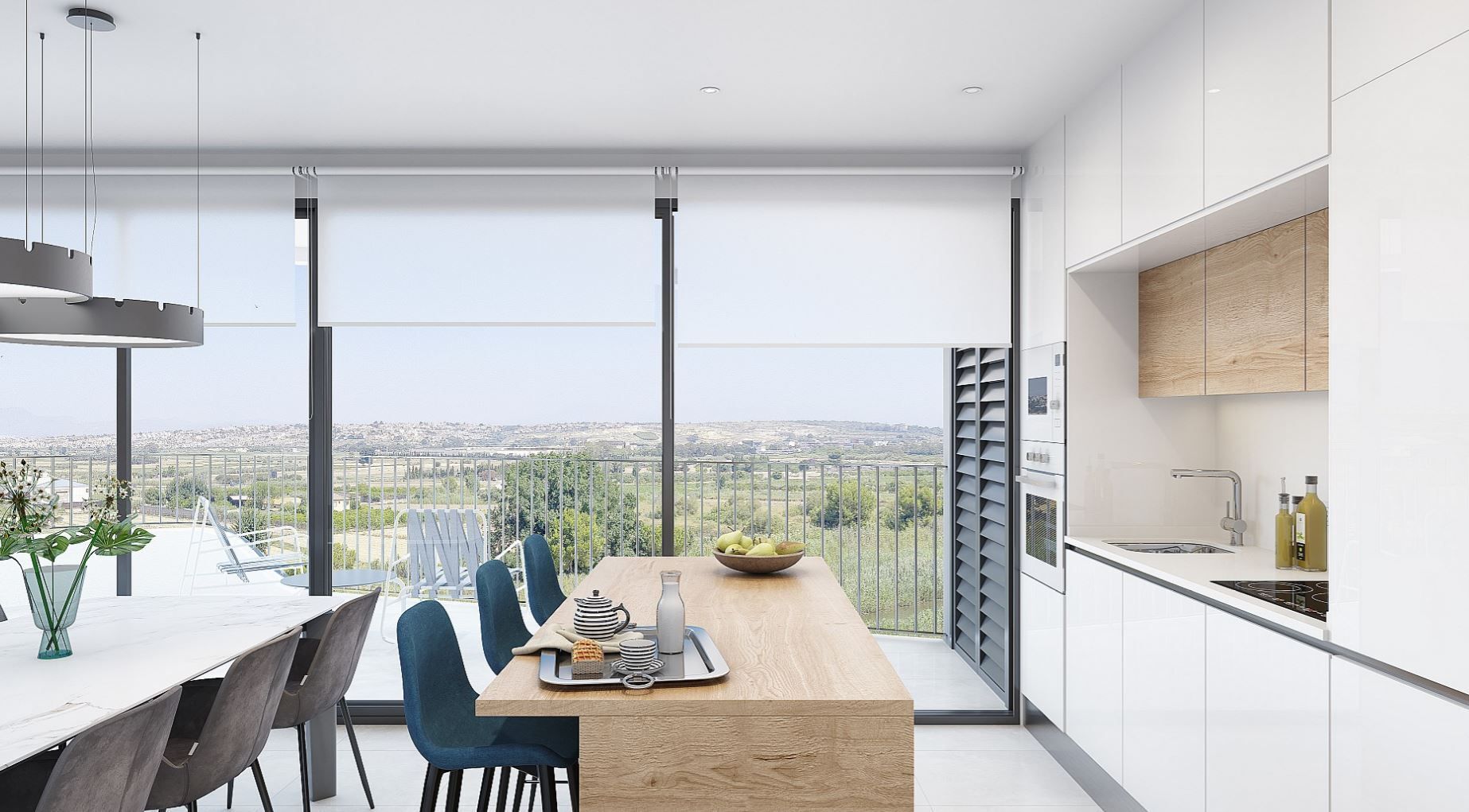Tegen de zijkant van de woonkamer is de keuken gesitueerd; tegen de wand aan, met een eiland ervoor.