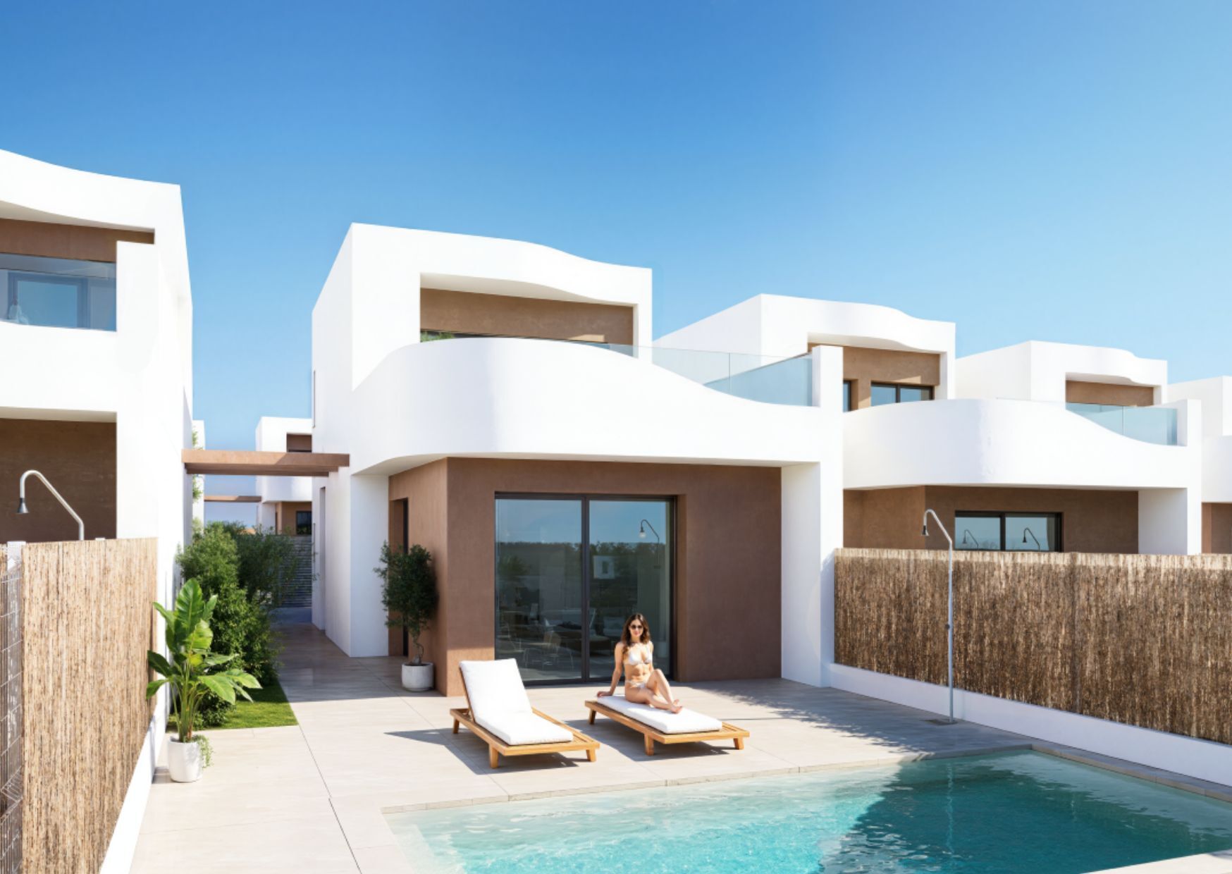In totaal beschikt de villa over 3 slaapkamers en 2 badkamers. De master bedroom bevindt zich op de begane grond en heeft een en-suite badkamer, terwijl de twee gastenkamers op de verdieping de tweede badkamer delen. Alle slaapkamers zijn voorzien van inbouwkasten met roede, lades en planken.