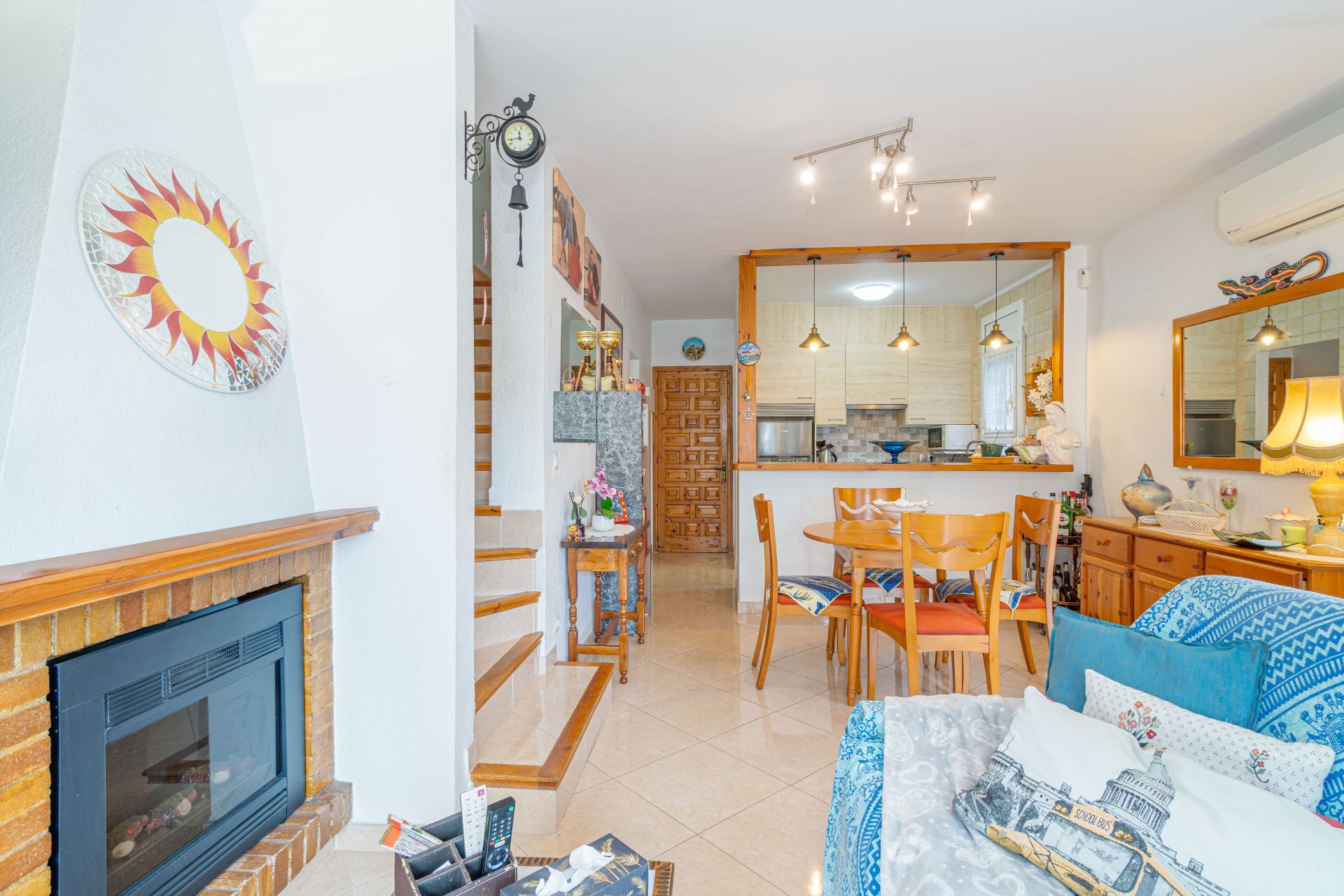 Op de begane grond bevindt zich de sfeervolle woonkamer met zit- en eetgedeelte. De open haard zorgt voor extra sfeer in de wintermaanden, terwijl de airconditioning het binnenklimaat ook in de zomer aangenaam houdt. Aansluitend ligt de moderne open keuken, die recent is vernieuwd en volledig is uitgerust met onder andere een koelkast, vaatwasser en alle benodigde apparatuur. Op deze verdieping bevindt zich ook een praktische badkamer met douche.
