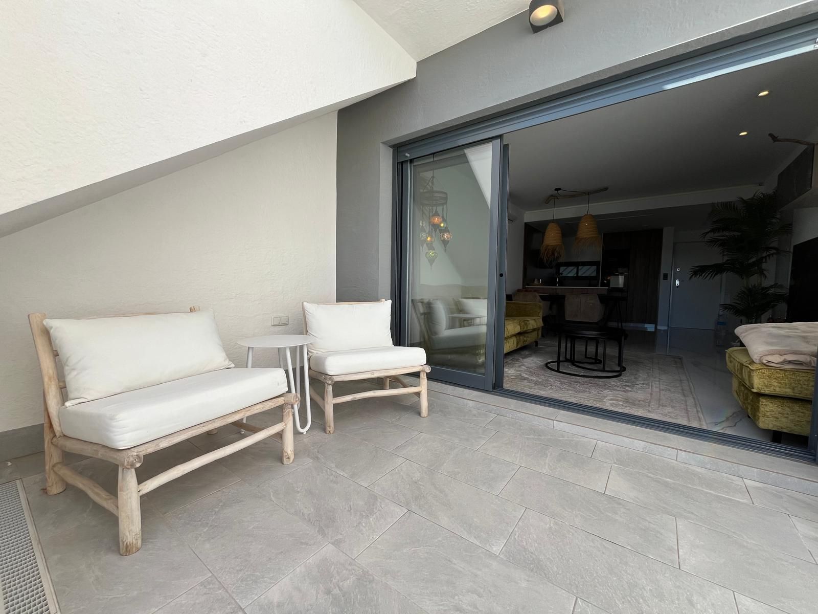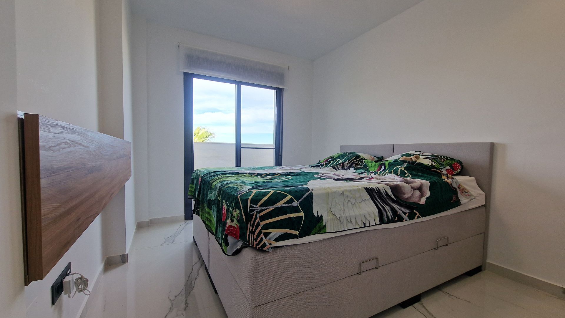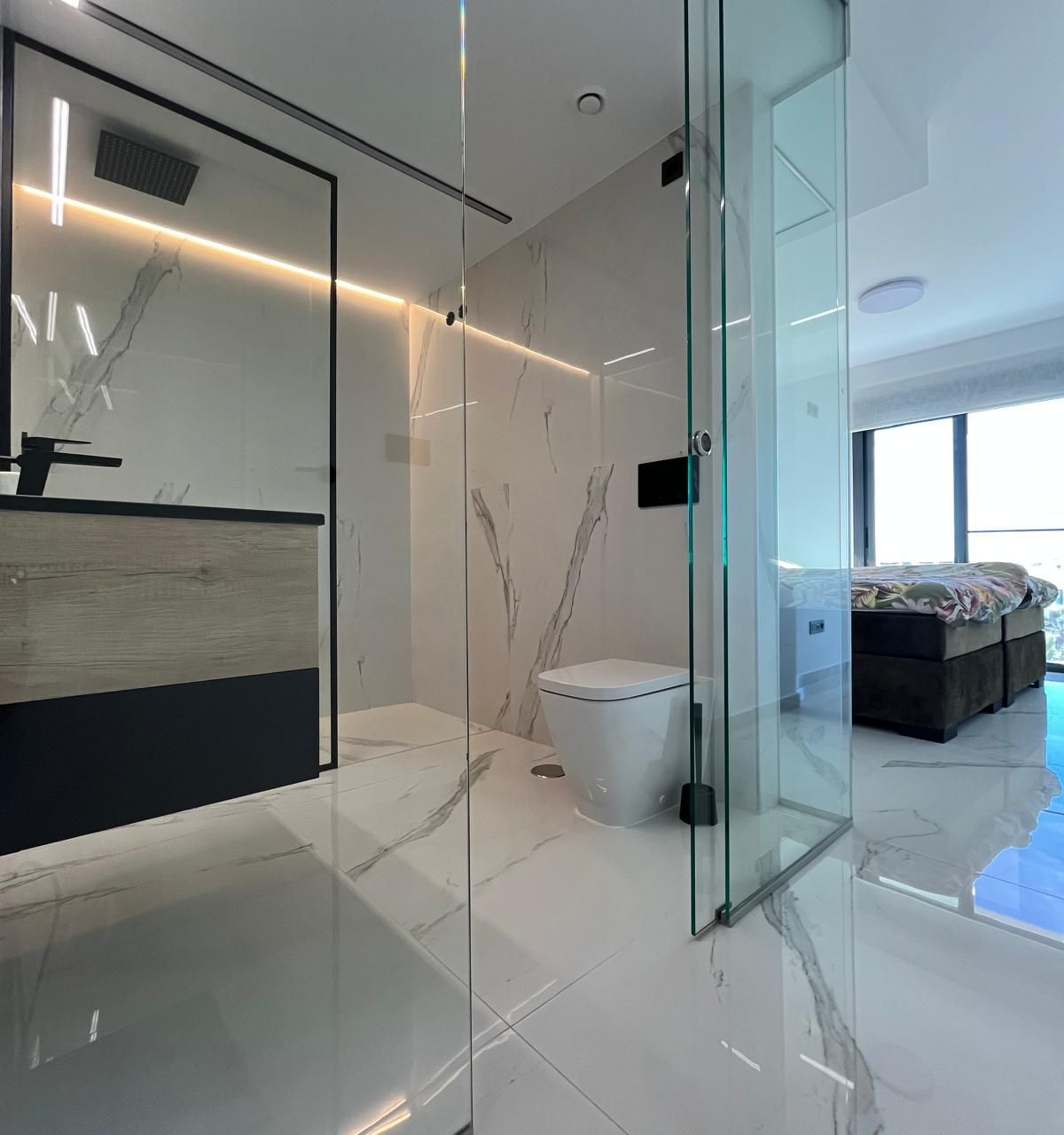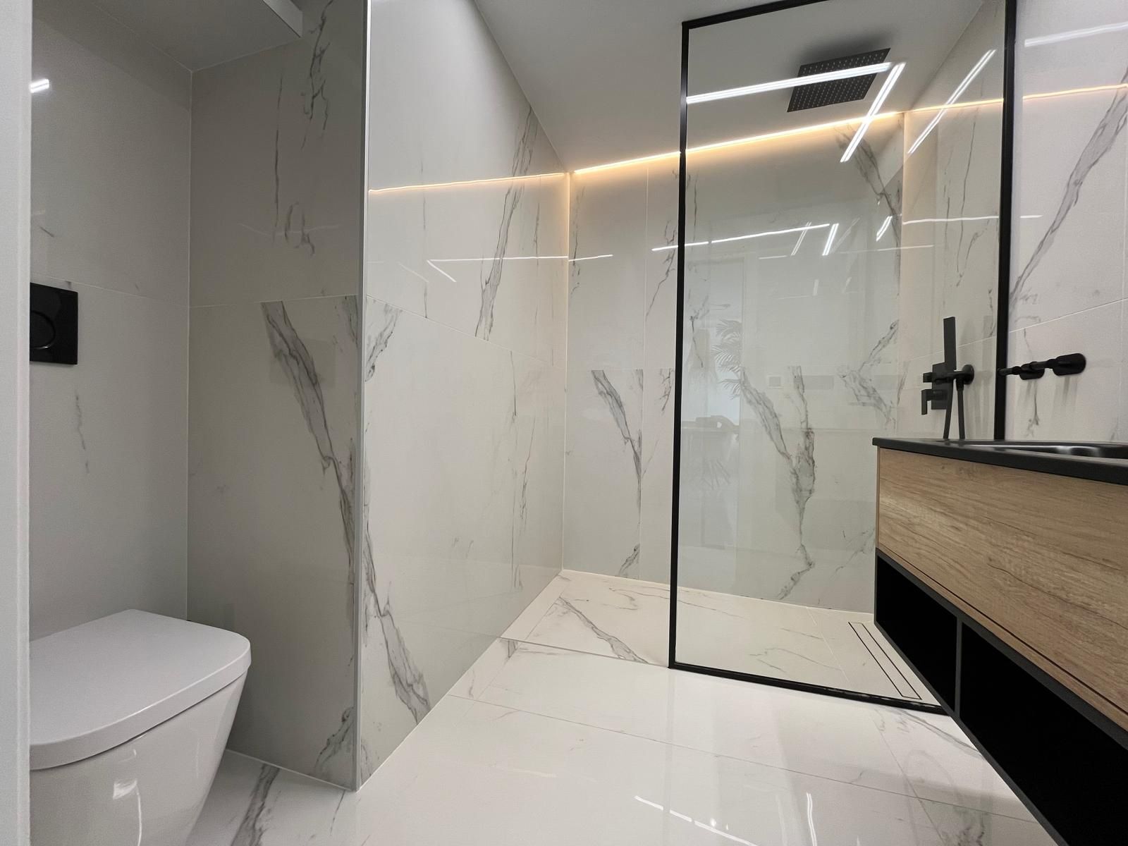 Het penthouse beschikt over twee ruime slaapkamers, waaronder een master bedroom met en-suite badkamer. Beide badkamers hebben een hotelwaardige uitstraling met hoogglans marmerlook tegels, extra brede douches, matte zwarte details en zwevende wastafels. Overal zijn vliegenramen en vliegengordijnen geplaatst voor optimaal comfort.