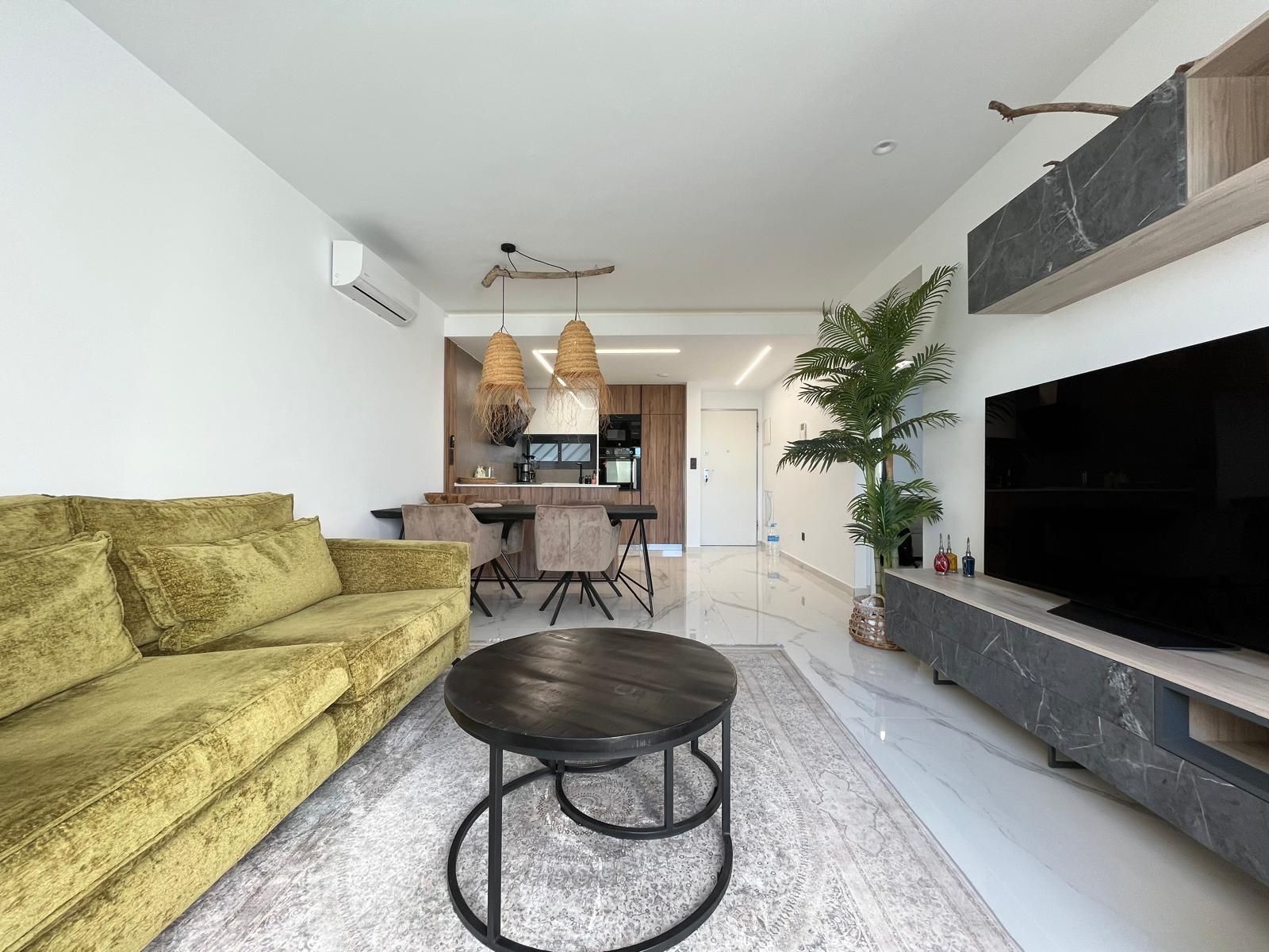 Bij binnenkomst valt direct de lichte en elegante uitstraling op. Door het hele appartement liggen glossy White Soul-tegels van 120×120 cm die de leefruimtes naadloos met elkaar verbinden. De woonkamer is ruim opgezet, geniet van veel daglicht en heeft directe toegang tot het zuidelijk georiënteerde terras, waardoor binnen en buiten prachtig samensmelten.