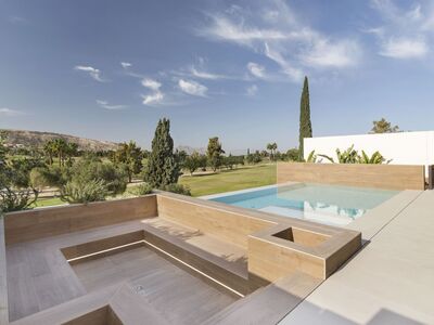 Een prachtig design met uitzicht op de golf en de achterliggende bergen. 5 minuten van het dorpje Algorfa, 15 minuten van het strand van Guardamar en 30 km van de luchthaven van Alicante.