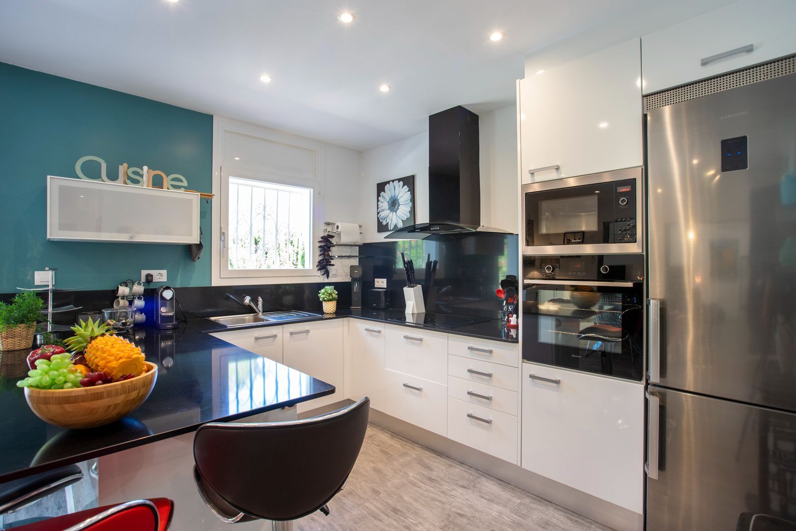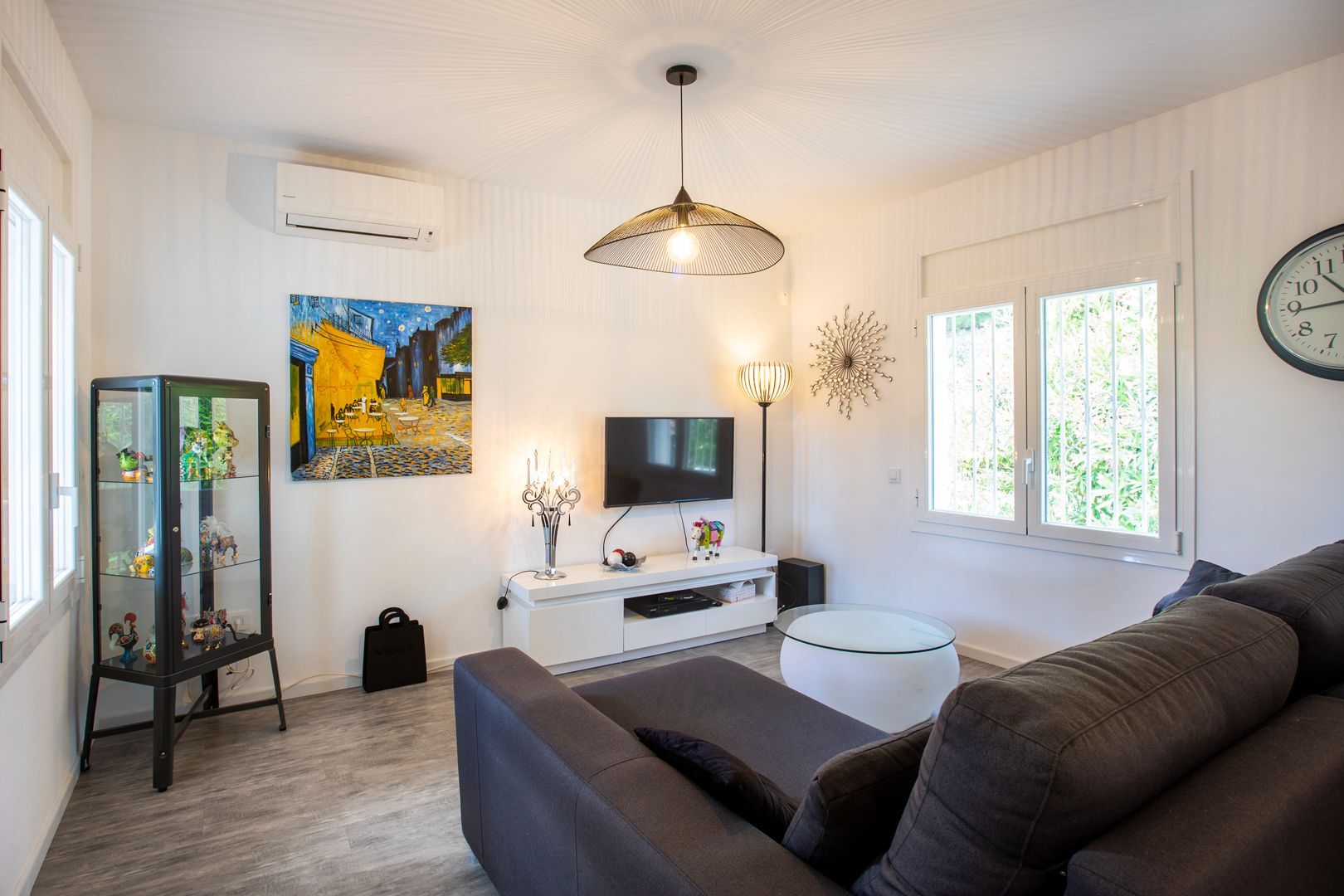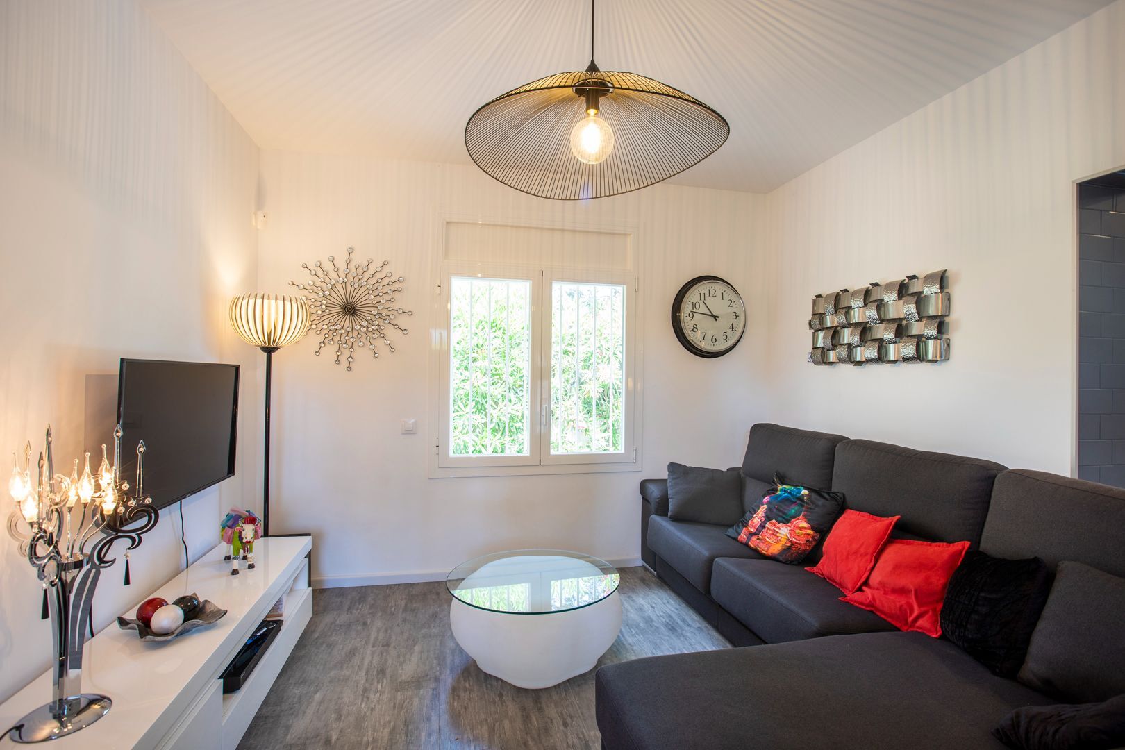 De woonkamer heeft twee toegangen, zowel aan de achterzijde van de woning als via de hoofdingang. Aan de voorzijde bevindt zich een zonnig terras op het zuiden, een fijne plek om te ontspannen en volop te genieten van het mediterrane klimaat. Voor extra comfort is de woning uitgerust met airconditioning, hoogwaardige PVC-ramen en -deuren met dubbele beglazing en een alarmsysteem. De villa wordt gedeeltelijk gemeubileerd verkocht met moderne meubels, waardoor het geheel direct een verzorgde en eigentijdse uitstraling heeft. Als extra luxe beschikt de woning over een privé jacuzzi, perfect voor ontspanning in alle rust.