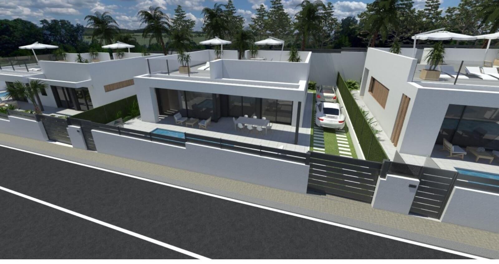 Deze villa’s liggen in een urbanisatie, of beter gezegd dorp, op slechts een paar kilometer van de golfbaan Lo Romero.