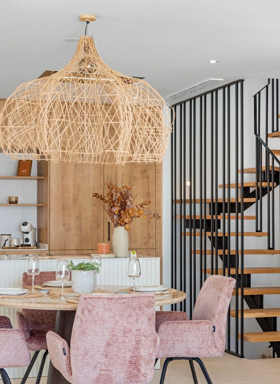 Bij binnenkomst komt u direct in de ruime woonkamer met open keuken, samen goed voor circa 45 m². Grote schuifpuien bij de zithoek zorgen voor veel licht en een sterke verbinding met het terras. Centraal in de ruimte is plaats voor een royale eettafel, terwijl de luxe keuken aan de achterzijde is gesitueerd. Deze is uitgevoerd met hoge en lage kasten en een groot kookeiland, ideaal voor koken en gezellig samenzijn.